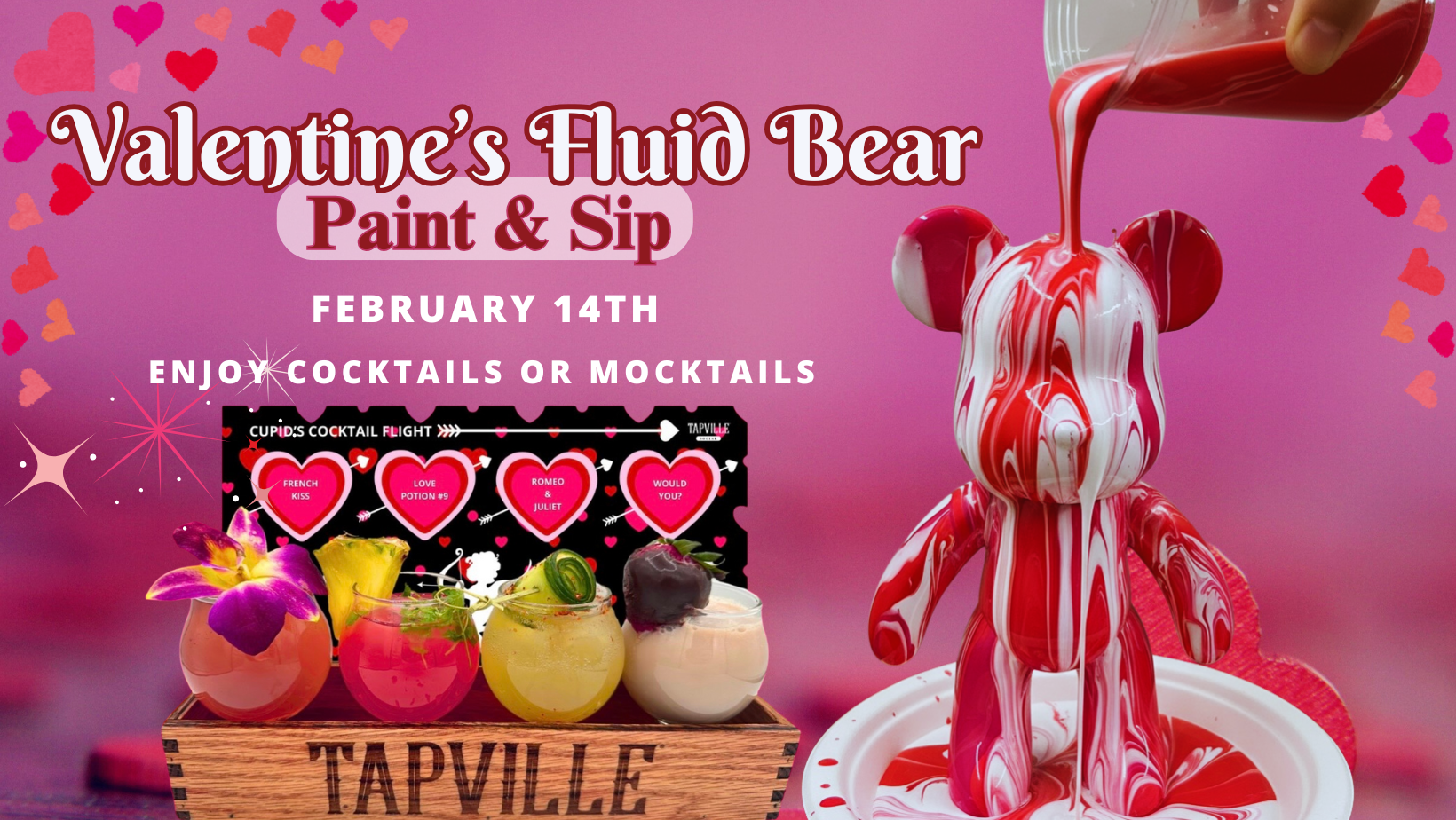You’ll create your own Fluid Bear statue masterpiece using high-quality fluid acrylic paints while enjoying cocktails, mocktails, craft beer, or wine available for purchase at Tapville Social Denver. Be sure to come hungry, Tapville also offers an amazing food menu, perfect for turning your paint & sip into a full Valentine’s night out. Together, we’ll pour, swirl, and create in a festive, Valentine’s-themed atmosphere designed for those instagram worthy pics!